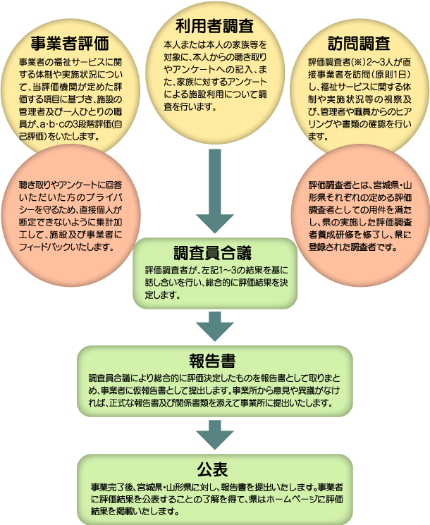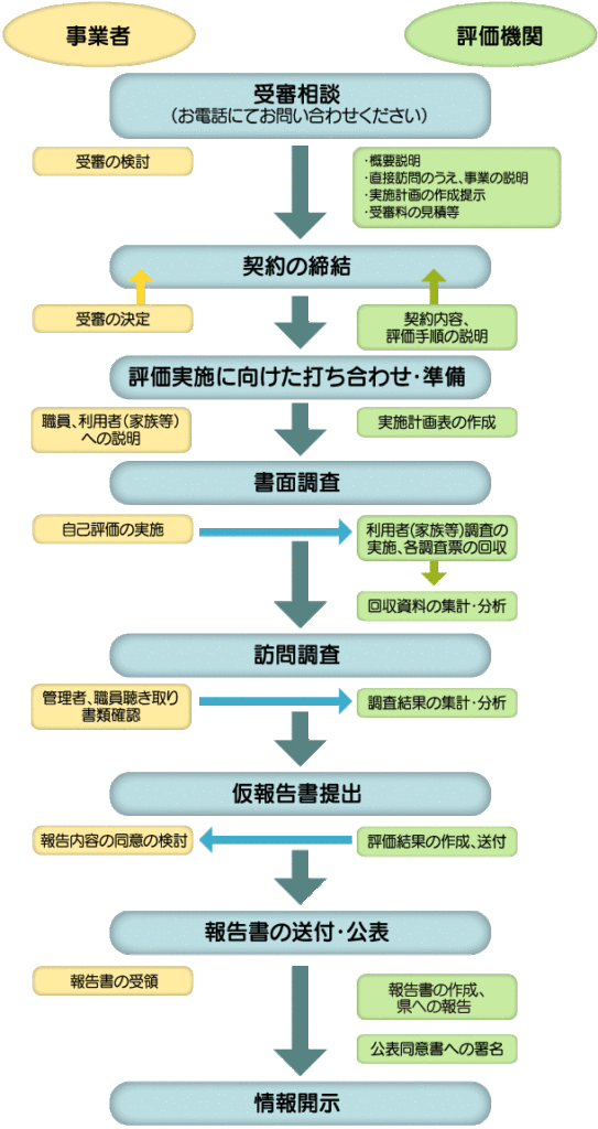 2. サービスの質の向上を目指す経営者への支援を目的とし、当事者(事業者・利用者)以外の公正、中立な第三者機関が、専門的かつ客観的な立場から事業者を評価するものです。